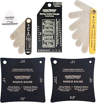 - String Action Gauge: Accurate Measurements that are Easy to Read with our Innovative Black Finish Contrasted with Deep Etched White Markings. Measurements in Inches, Metric & 64ths.Radius Gauge Set: Accurate Measurements 7.25”, 9.5”, 10”, 12”, 14”, 15”, 16”, 20”